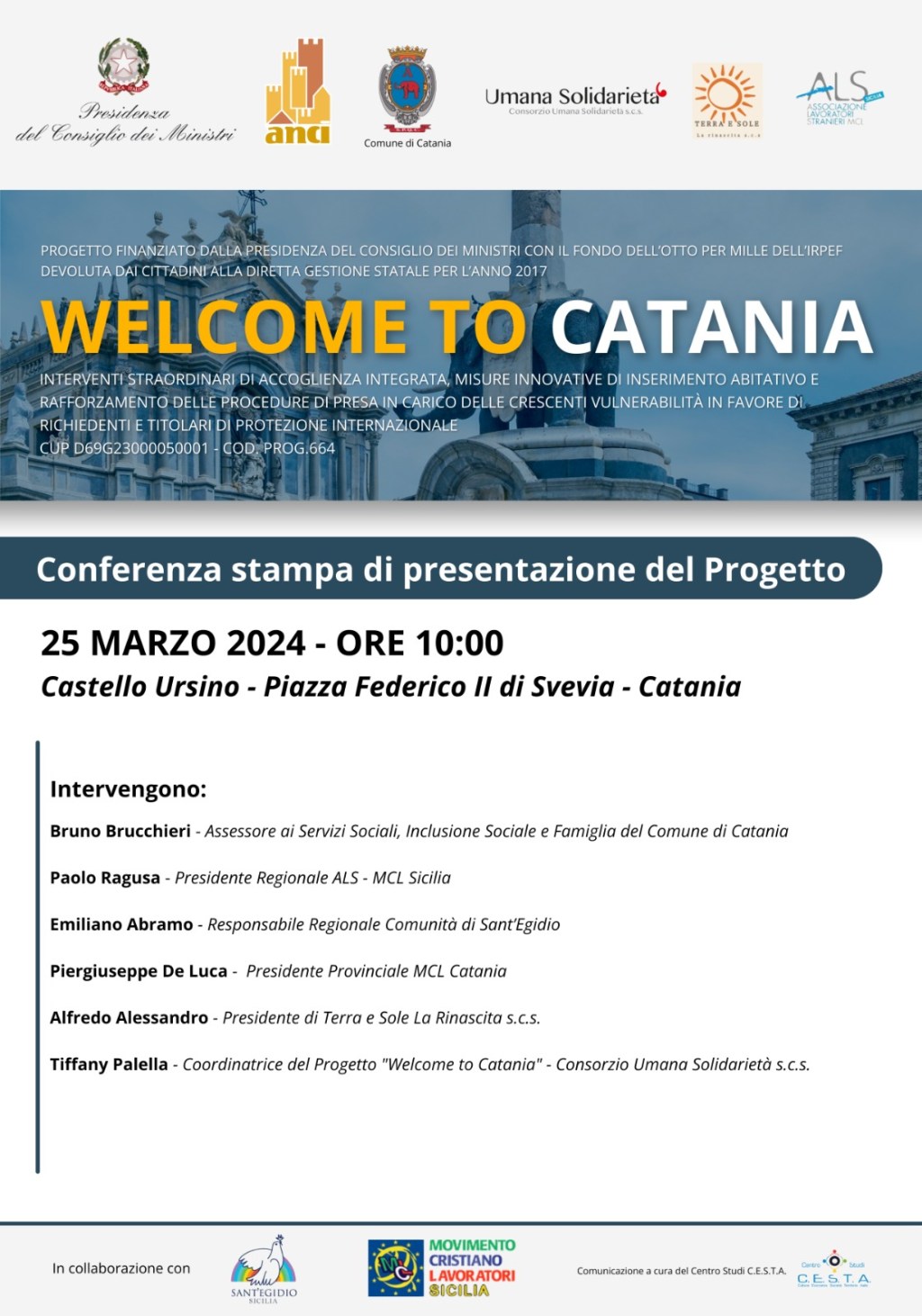 Sarà presentato lunedì 25 marzo, alle ore 10, all’interno del Castello Ursino di Catania, piazza Federico II di Svevia, il progetto “Welcome to Catania” promosso dall’ANCI e finanziato dalla Presidenza del Consiglio dei Ministri (a valere sul fondo dell’otto per mille dell’IRPEF devoluta dai cittadini alla diretta gestione statale per l’anno 2017) alla Direzione Famiglia e Politiche sociali del Comune di Catania, e gestito dal Consorzio Umana Solidarietà s.c.s, in partnership con Terra e Sole La Rinascita s.c.s. e ALS MCL Sicilia, e in collaborazione con la Comunità di Sant’Egidio – Sicilia ODV ET e MCL Sicilia.