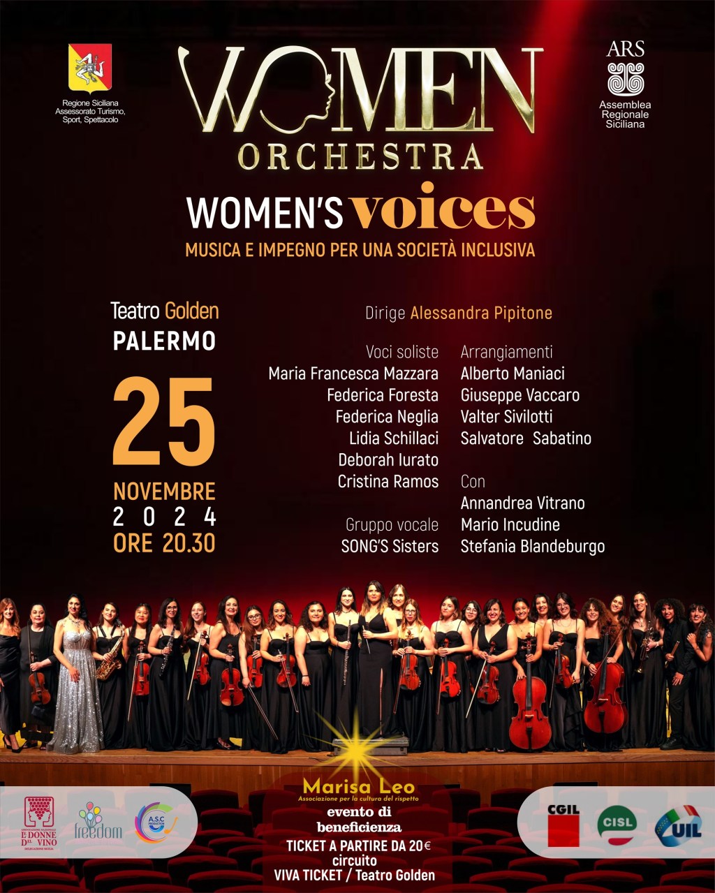 Women Orchestra, Annandrea Vitrano, Stefania Blandeburgo, Cristina Ramos dalla Spagna, Deborah Iurato, Lidia Schillaci, SONG’S Sisters, Maria Francesca Mazzara, Federica Foresta e Federica Neglia. Sono le artiste, tutte donne, che si esibiranno in concerto il prossimo 25 novembre 2024 al Teatro Golden di Palermo. Un’importante iniziativa della Women Orchestra, l’orchestra tutta al femminile nata il 25 novembre del 2017, che per la ricorrenza ha voluto riunire cantanti, musiciste e attrici in Women’s Voices, uno spettacolo all’insegna della musica e dell’impegno a favore di una società inclusiva.