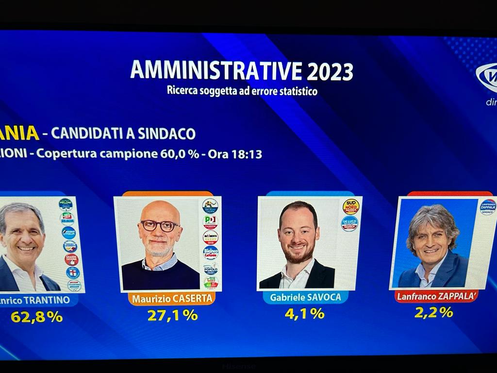 Quarta proiezione di Noto Sondaggi per Vr Sicilia a Catania su un campione del 45% Enrico Trantino si attesta tra il 62,8. Distaccato Maurizio Caserta al 26,4.