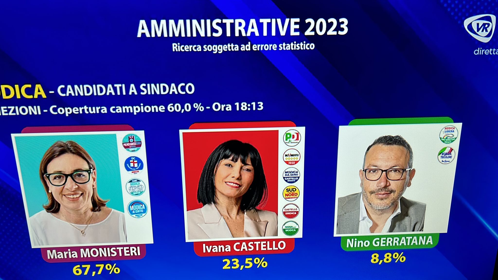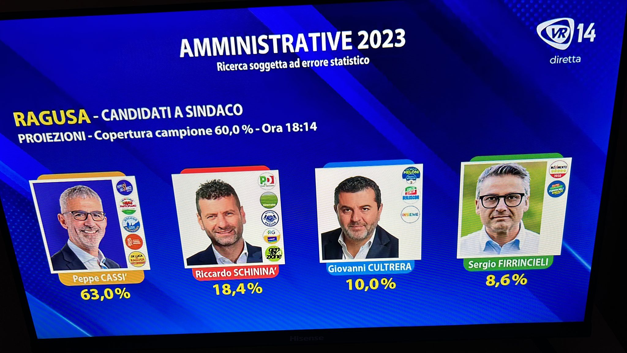 Alle elezioni comunali di Ragusa il sindaco uscente Giuseppe Cassì – candidato di cinque liste civiche – è avanti negli exit poll (Noto sondaggi per Videoregione Sicilia) con una forbice compresa tra il 63.