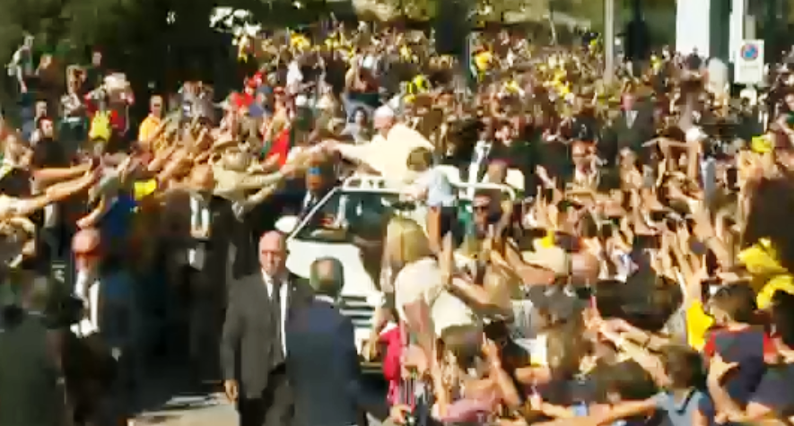 Dopo aver incontrato un disoccupato, un lavoratore, un gruppo di ammalati, insomma i rappresentanti della società civile , uomini e donne qualsiasi chiamati a rappresentare tutti Papa Francesco lascia Piazza Armeribna. Lo fa con la Papa mobile che procede lentamente per permettergli di stringere mani, salutare la folla, profondere altre benedizioni accompagnato da una pvazione: “Francesco, Francesco!”.