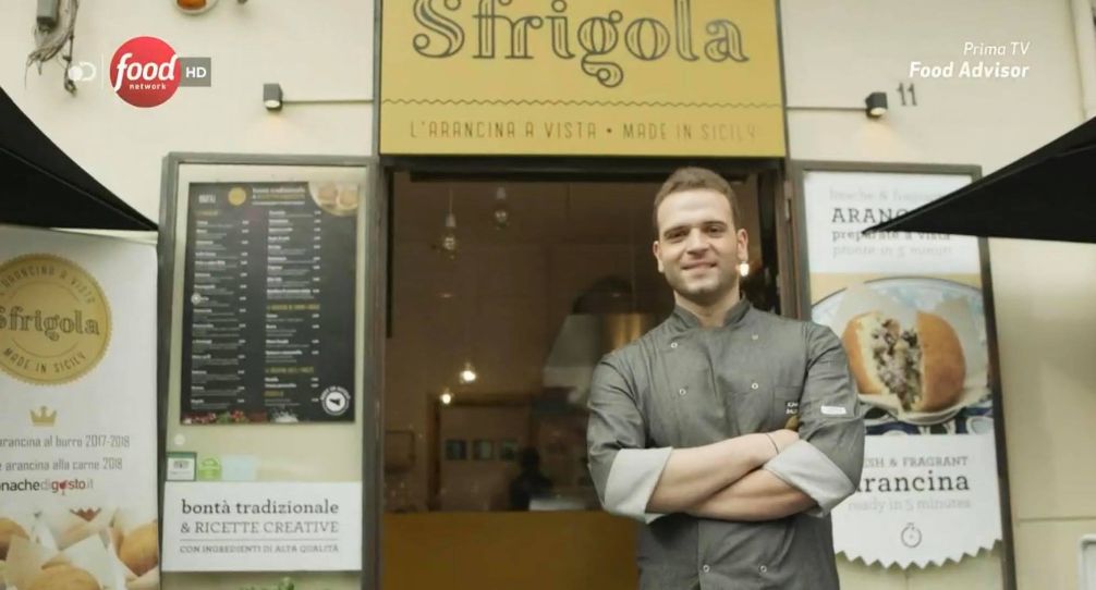 La tappa palermitana di Food Advisor, il noto programma del canale Food Network condotto dallo chef Simone Rugiati, lo ha portato in giro per il capoluogo siciliano alla ricerca della migliore versione del cibo da strada per giungere a considerare quella di Sfrigola la migliore arancina.