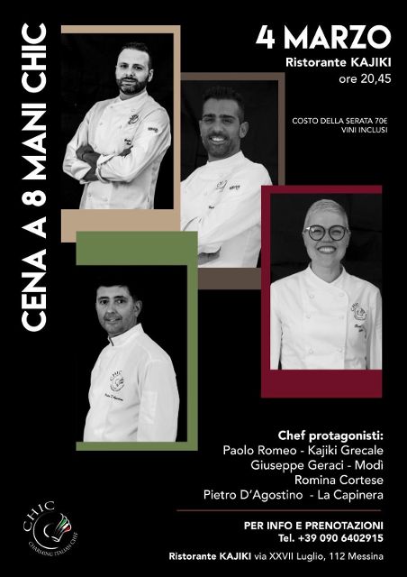 Saranno quattro gli chef che lavoreranno insieme le cui mani, otto per l’esattezza, prepareranno una raffinata cena al ristorante Kajiki Grecale di Messina il prossimo 4 marzo.