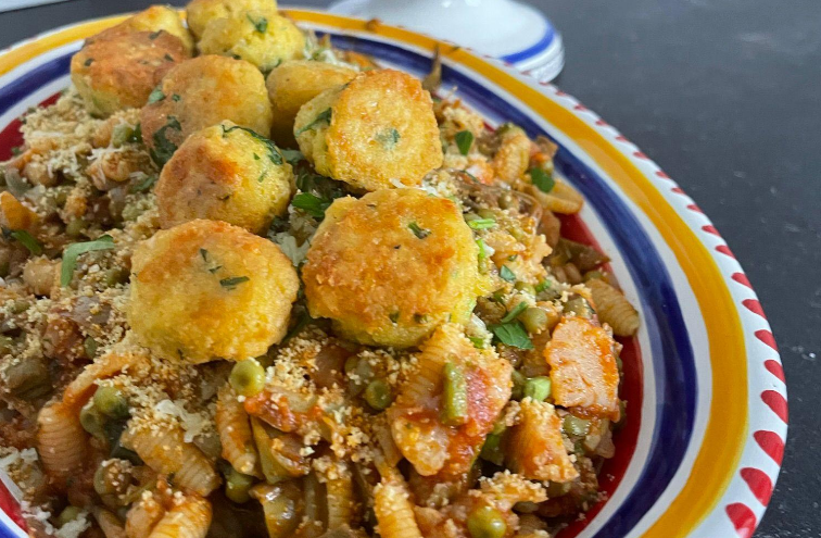Fare un trito di cipolla e rosolare con olio su fiamma media. Unire i carciofi tagliati a fettine sottili e i piselli. Aggiungere la salsa e cuocere a fuoco dolce per una mezz’oretta. Sbollentare le punte degli asparagi, le cimette di cavolfiore e i cavolicelli, in pentole separate. Con le uova, il prezzemolo, il caciocavallo, sale, pepe e il pangrattato necessario per poter ottenere un composto modellabile con le mani, formare delle polpette e friggetele in olio d’oliva ben caldo. Unire alla salsa le verdure sbollentate e tagliate a pezzetti, regolare di sale e pepe. Cuocere per altri 15-20 minuti. Sbollentare la pasta e, appena pronta, maneggiare con il condimento Aggiungere nel piatto di portata le polpette di pane e finire con muddica atturrata e caciocavallo.