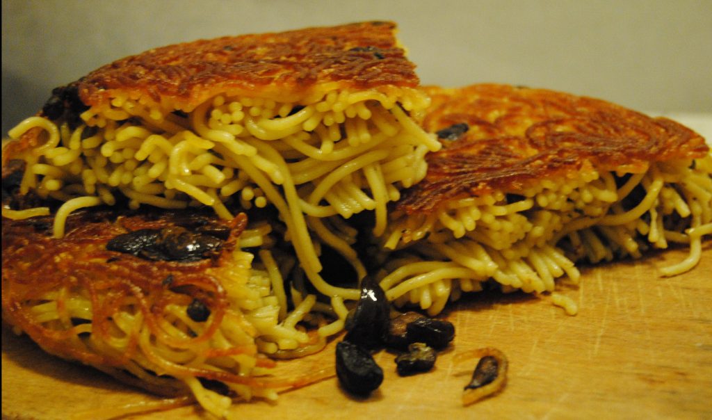 Iniziate a cuocere i vermicelli in abbondante acqua salata, per circa metà del tempo di cottura. Mettete in padella l’olio, le olive, i pinoli, le acciughe, i capperi dissalati e lo spicchio d’aglio; fate insaporire pochi minuti. Scolate la pasta. In una ciotola mettete i vermicelli e il condimento che avete insaporito in padella (senza l’aglio), il prezzemolo tritato finemente e una grattugiata di pepe. Mescolate bene tutto. Ripassate nuovamente tutto in padella, pressate leggermente gli spaghetti, e fate cuocere la frittata per 30 minuti, girandola a metà cottura. Cercate di far cuocere bene la frittata, al centro come ai bordi.
