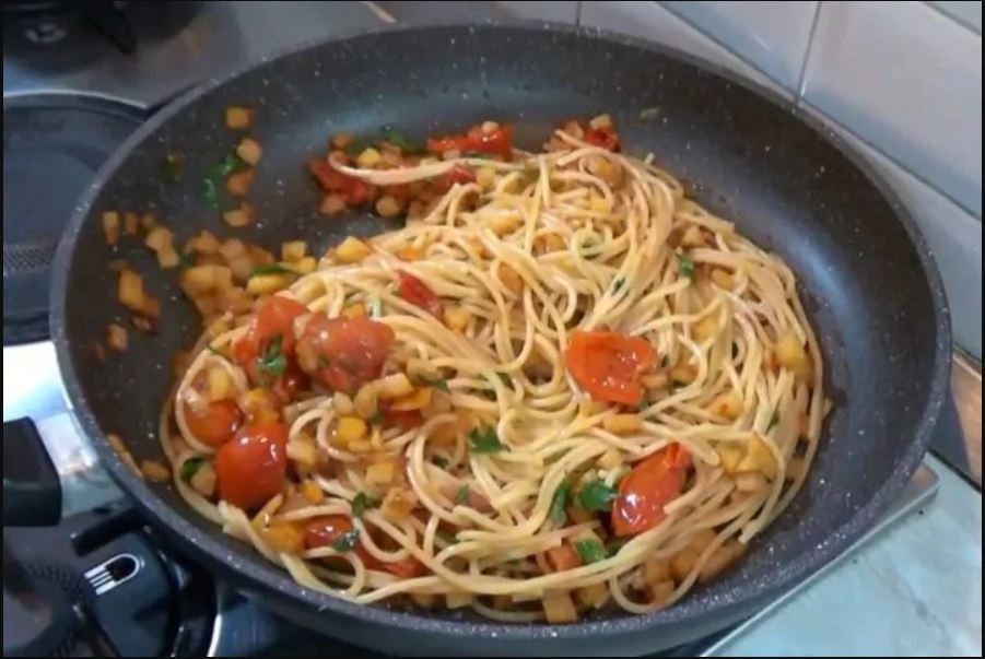 Prendiamo una padella e mettiamo a scaldare dell’olio. Inseriamo la cipolla tagliata e facciamola rosolare. Mentre rosolano inseriamo anche le patate tagliate a dadini: i dadini devono essere piccolissimi, più piccoli sono, più avranno la possibilità di cuocere in fretta e in maniera omogenea. Quando il tutto comincerà ad imbiondire, allora mettiamo i pomodorini tagliati in due. Li aggiungiamo alla fine perché così non si spappoleranno e manterranno un po’ di croccantezza ( sempre se piace). Mentre il tutto cuoce, abbiamo messo su la pentola dell’acqua.