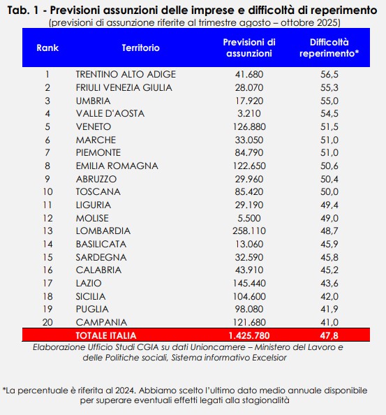 A livello provinciale Pordenone è in cima alla classifica con il 56,8% di difficoltà, seguita da Bolzano e Trento (56,5%) e Gorizia (56,1%). All’estremo opposto, i territori dove reperire manodopera è più “facile”: Caserta (39,3%), Salerno (38,3%) e Palermo (36,9%).