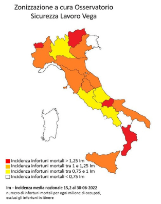 L’osservatorio ha, infatti, elaborato una zonizzazione a colori, una elaborazione grafica, che dipinge il rischio infortunistico nelle regioni italiane secondo una scala di colori (rosso: incidenza infortunistica superiore al 125% della media nazionale; arancione: incidenza compresa tra la media nazionale e il 125% della media nazionale; giallo: incidenza tra il 75% e la media nazionale; bianco: incidenza inferiore al 75% della media nazionale).