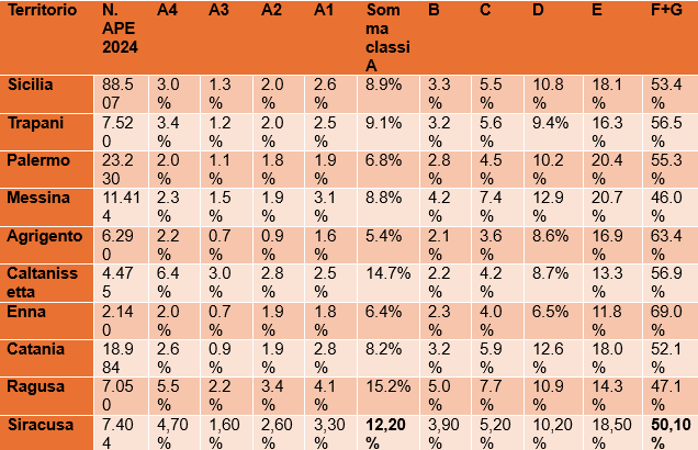 L’analisi territoriale evidenzia significative differenze tra le province siciliane. Nel 2024, il maggior numero di APE di classe F e G si riscontra a Enna (69%) e Agrigento (63,4%), seguite da Trapani (56%), Caltanissetta (56,9%), Palermo (55,3%), Catania (52,1%), Siracusa (50,1%), Ragusa (47,1%) e Messina (46%).