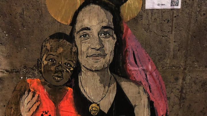 Un graffito con Carola Rackete, il capitano della Sea Watch, che tiene in braccio un bimbo africano. È l’ultima opera realizzata da Tvboy – l’autore del bacio Di Maio-Salvini – questa volta a Taormina, in via del Crocifisso. Nel disegno, intitolato ‘Santa Carola protettrice dei rifugiati’, si vede la giovane tedesca tenere in braccio un bimbo africano con il giubbotto di salvataggio. Sul braccio sinistro invece tiene una borsetta di primo soccorso.
