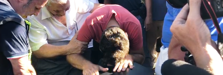 Piange, piegato sulla cassa che continene i resti di Gioele il bimbo di 4 anni scomparso con la madre Viviana parisi il 3 agosto e ritrovato ieri. Piange e batte la mano aperta su quealla cassa Daniele Mondello.