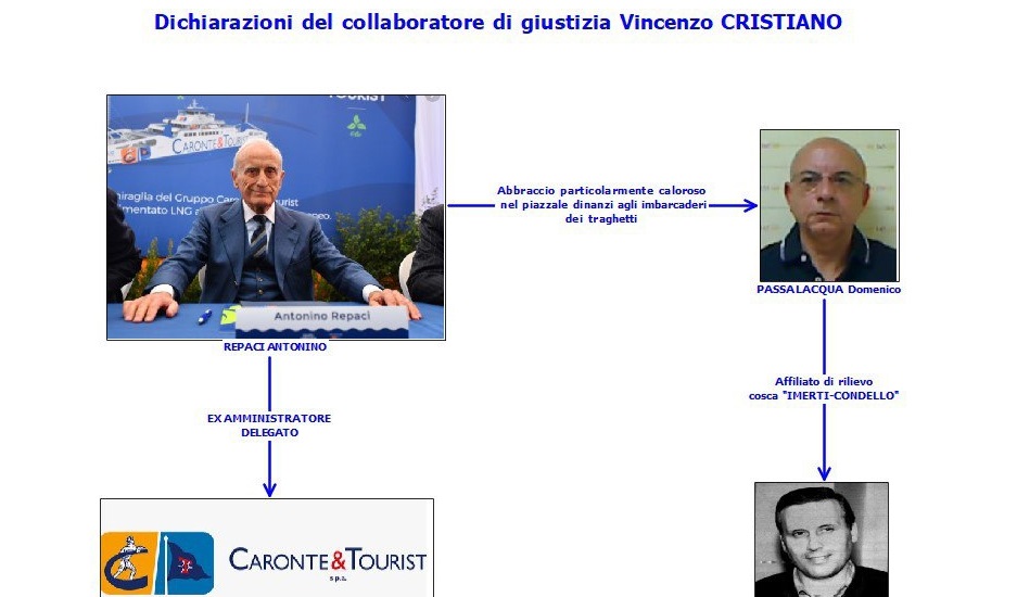 Secondo la ricostruzione dei magistrati calabresi, la società avrebbe dato in gestione alcuni servizi, tra cui la ristorazione, la disinfestazione, la pulizia e le prenotazione degli imbarchi ad imprese controllate da Domenico Passalacqua e Massimo Buda: il primo, condannato in via definitiva, è indicato dal collaboratore di giustizia Vincenzo Cristiano, come un esponente delle cosche Buda-Imerti e Zito, il secondo è il figlio di Santo Buda, che controlla le attività illecite a Villa San Giovanni. Gli stessi, come svelato dai magistrati, sarebbero stati anche dipendenti della galassia della Caronte&Tourist, e con un peso specifico non indifferente.