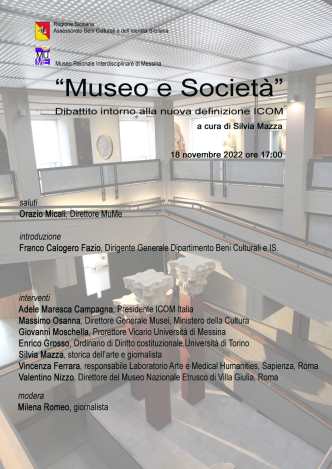 Su questo ruolo sociale dei musei, anche alla luce della pandemia che per la prima volta ne ha determinato una prolungata chiusura, e dunque preclusione a questa funzione pubblica, diversi specialisti di statura nazionale si confronteranno sul tema “Museo e società. Dibattito intorno alla nuova definizione Icom”, al Museo Regionale di Messina, venerdì 18 novembre alle 17, promosso dalla storica dell’arte Silvia Mazza, che ha dedicato diversi articoli all’argomento in piena emergenza.