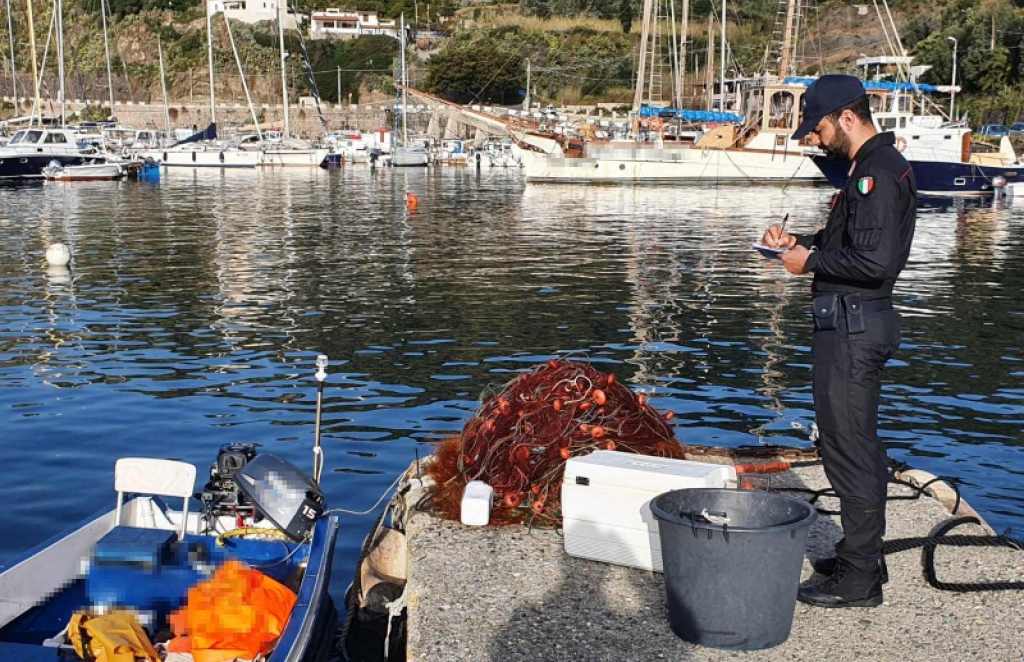 Prevenzione ed alla repressione della pesca non conforme alle leggi vigenti per i carabinieri della Motovedetta CC 814 “Monteleone” nelle isole Eolie. In particolare a Lipari, presso il porto Pignataro, l’equipaggio ha proceduto al controllo di una lancia in vetroresina della lunghezza di 4,20 metri con a bordo due giovani pescatori rinvenendo una rete da posta fissa lunga 200 metri, tra bogara e tramaglio, con ancora ammagliati pesci morenti, sauri e boghe, per complessivi 9,5 chili.