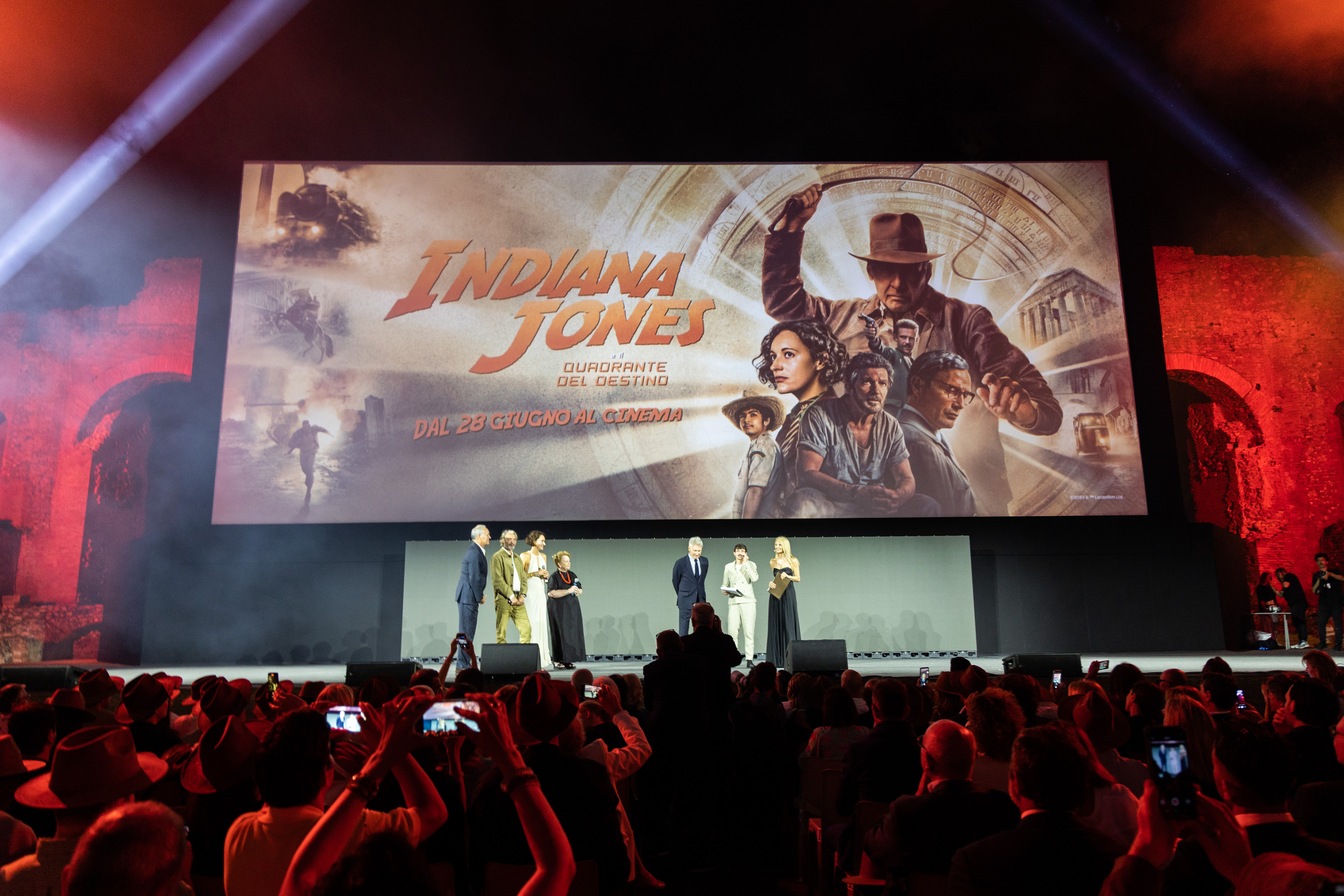 Ma Harrison Ford e gli interpreti del film si sono fatti perdonare dai migliaia di fan giunti in Sicilia da molteplici destinazioni quando, davanti alla gremitissima platea del Teatro – tutto sold out – sono apparsi con una scoppiettante sorpresa: i fuochi d’artificio intorno allo schermo che proiettava immagini di Indiana Jones davanti al mare della Sicilia, peraltro location di alcuni set.