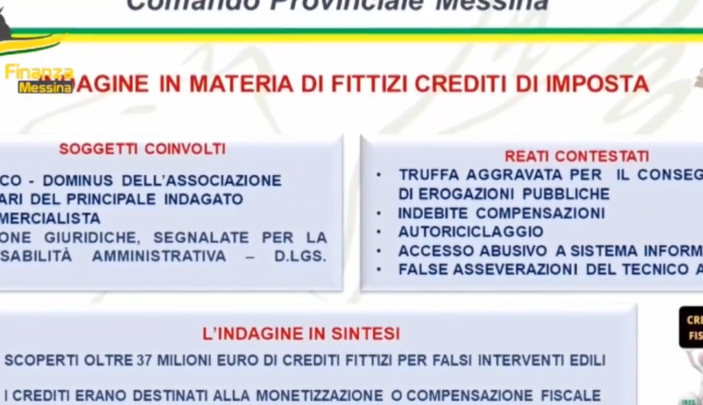 Sulla base dei primi accertamenti, quindi, i finanzieri del gruppo della guardia di finanza di Messina hanno accertato che le agevolazioni fiscali segnalate, riconducibili al Superbonus 110%, risultavano cedute, tramite la piattaforma denominata “cessione crediti” dell’Agenzia delle Entrate, ad una società, avente ad oggetto la locazione di beni immobili, poi risultata priva di personale e strutture idonee all’esercizio dell’attività.
