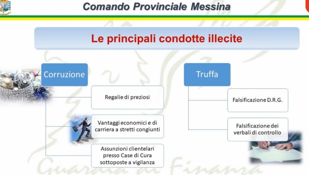 I finanzieri del comando provinciale di Messina hanno eseguito all’alba di oggi un’ordinanza che dispone, nei confronti di 3 persone, la misura cautelare del divieto temporaneo di esercitare attività imprenditoriali per 4 mesi e il sequestro di oltre 3 milioni di euro nei confronti di 7 strutture sanitarie private convenzionate. Il denaro, secondo gli inquirenti, sarebbe il frutto di una maxi truffa aggravata al servizio sanitario nazionale. L’inchiesta, coordinata dalla Procura guidata da Maurizio De Lucia, coinvolge 26 persone tra funzionari pubblici dell’Asp di Messina, responsabili e dipendenti delle strutture private.