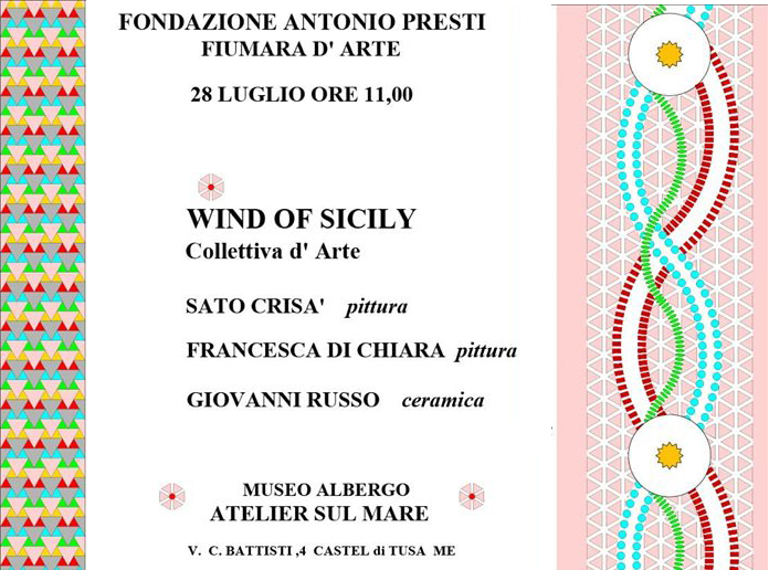 E’ questo il proposito della collettiva d’arte dal titolo “Wind of Sicily” che domenica 28 luglio, nel museo-albergo Atelier sul Mare di Antonio Presti, esporrà le opere degli artisti Sato Crisà, Francesca Di Chiara e Giovanni Russo.