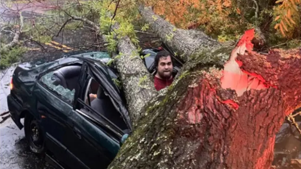 All’improvviso, però, un ramo gigante di un albero precipita sul veicolo e lo avrebbe sicuramente ucciso se solo non si fosse mosso appena pochi secondi prima.