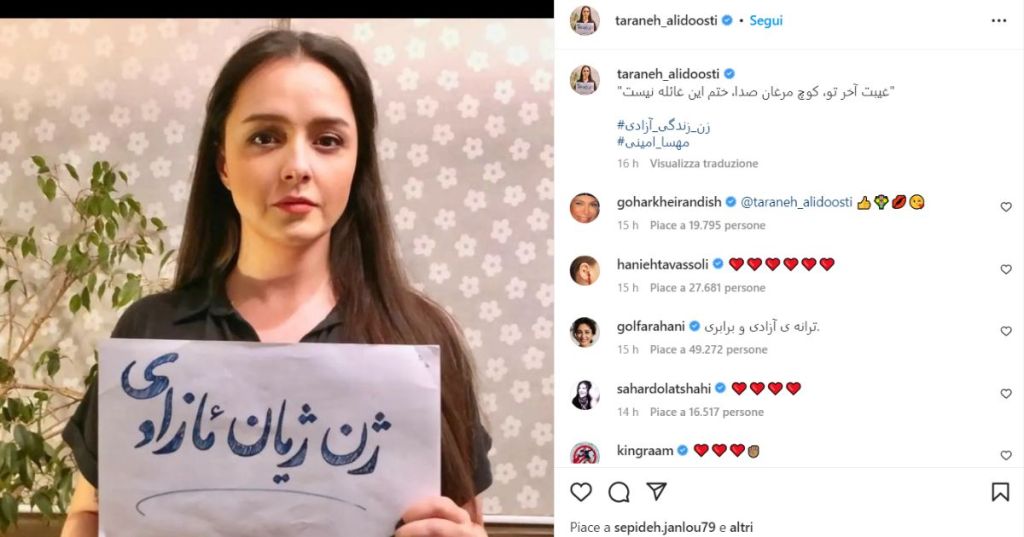Nella foto Alidoosti tiene un cartello che dice: “Donna, Vita, Libertà” in curdo, grido di battaglia dei manifestanti che da settimane scendono in piazza in Iran. Il post ha raccolto oltre 1,4 milioni di Mi piace.