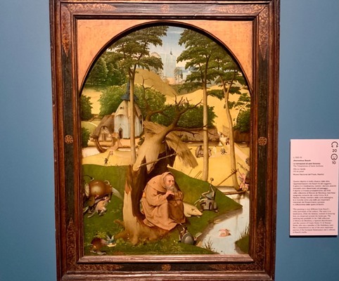Quadri ricchissimi di minuti particolari invitano lo spettatore a perdercisi dentro per coglierne il più possibile, come accade per Il Trittico delle Tentazioni di Sant’Antonio (che ha lasciato il Portogallo solo un paio di volte nel corso del Novecento e giunge ora in Italia per la prima volta), opera magistrale ed emblematica in quanto presenta tutte le caratteristiche associate al suo nome: fuochi infernali le cui fiamme guizzano contro il cielo notturno, architetture intricate e soprattutto i tanti mostri, ibridi e personaggi grotteschi che si muovono in scene inquietanti e stravaganti, tanto da far parlare di “immaginario boschiano”.