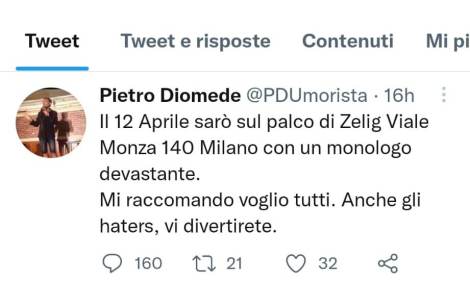 Doveva essere sul palco di Zelig il 12 aprile prossimo, ma la direzione artistica del noto locale di via Monza, a Milano, ha deciso di tagliare la partecipazione di Pietro Diomede dopo la sconcertante battuta pubblicata dall’umorista di Follonica su Twitter a proposito della uccisione della attrice hard Charlotte Angie.