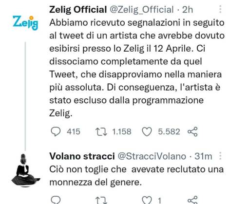 Sono tante le battute estremamente “scorrette” e decisamente “sopra le righe” dell’umorista toscano sul suo profilo Twitter e sul suo canale YouTube, che lui definisce come satira, possono essere effettivamente disturbanti. Il tweet è stato segnalato da qualche utente e, quindi rimosso dal social network per aver violato le regole. Resta invece il post con cui l’umorista comunica la sua ormai sfumata partecipazione allo spettacolo, con tanto di commenti irridenti per la sua esclusione, ritenuta meritata. Non ci sono, ancora, suoi commenti sulla decisione della direzione artistica dello Zelig.