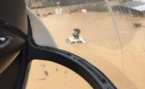 Un uomo, raggiunto dall’alluvione, non ha esitato a prelevare il suo cane, salendo sul tetto di una macchina. Per fortuna è stato notato da un elicottero della Guardia Civil che ha provveduto al salvataggio. Ancora poco, ed il peggio avrebbe sopraffatto la disperata resistenza dell’uomo e del suo cane, terrorizzato per quanto stava accadendo.