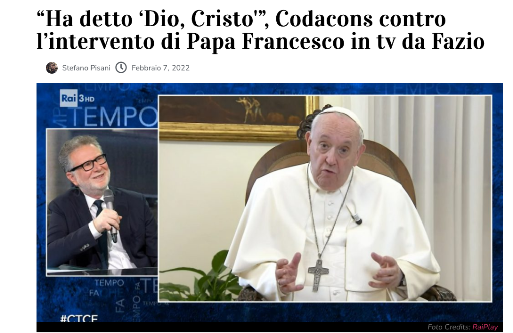 Eppure, il Codacons, la nota associazione a difesa dei consumatori, ha chiesto ufficialmente a Lercio di smentire l’esistenza di un comunicato, condiviso dalla testata satirica, con cui si finge un duro attacco dell’associazione contro il Papa e la sua intervista da Fabio Fazio a Che tempo Che Fa, andata in onda domenica scorsa. Il post ‘incriminato’ ha come titolo: “Ha detto ‘Dio, Cristo’”, Codacons contro l’intervento di Papa Francesco in tv da Fazio.