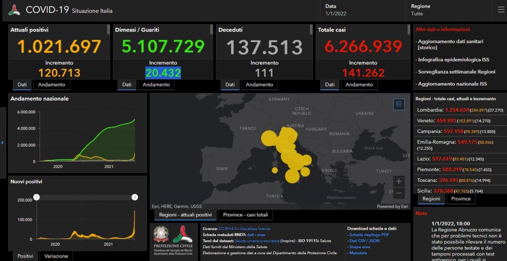 Sono 1.021.697 gli attualmente positivi al Covid in Italia, 120.713 in più rispetto a ieri. Dall’inizio della pandemia i casi totali sono 6.266.939 e i morti 137.513. I dimessi e i guariti sono invece 5.107.729, con un incremento di 20.432 rispetto a ieri.