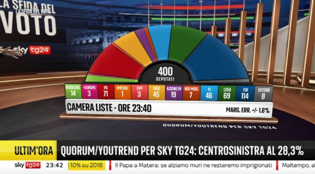 In base al secondo Instant poll di Quorum/Youtrend per Sky Tg24, con un errore di margine del più o meno 1,6%, al Senato a Fratelli d’Italia andrebbero 67 seggi, al Partito Democratico 38 e alla Lega 28. Al Movimento 5 Stelle andrebbero 24 seggi, a Forza Italia 18 seggi e ad Azione 10 seggi.