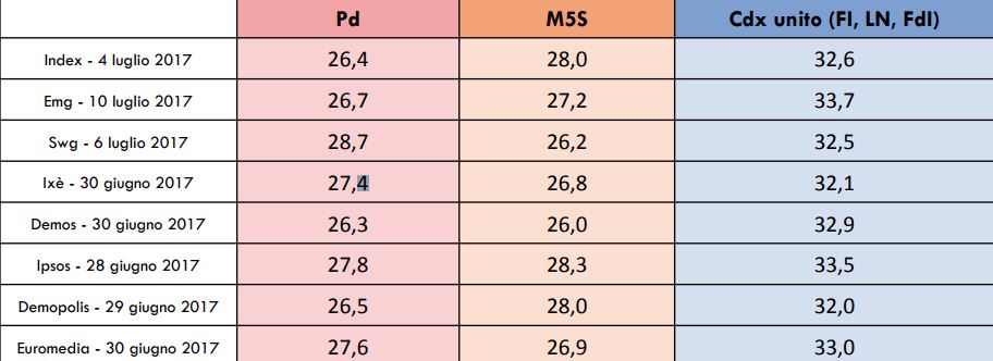 Partendo proprio dall’ultimo rilevamento, quello condotto da Emg appena un giorno fa, si scopre che Lega, Fi e Fratelli d’Italia sarebbero al 33,7 per cento, il M5S al 27, 2 ed il Pd al 26,7.