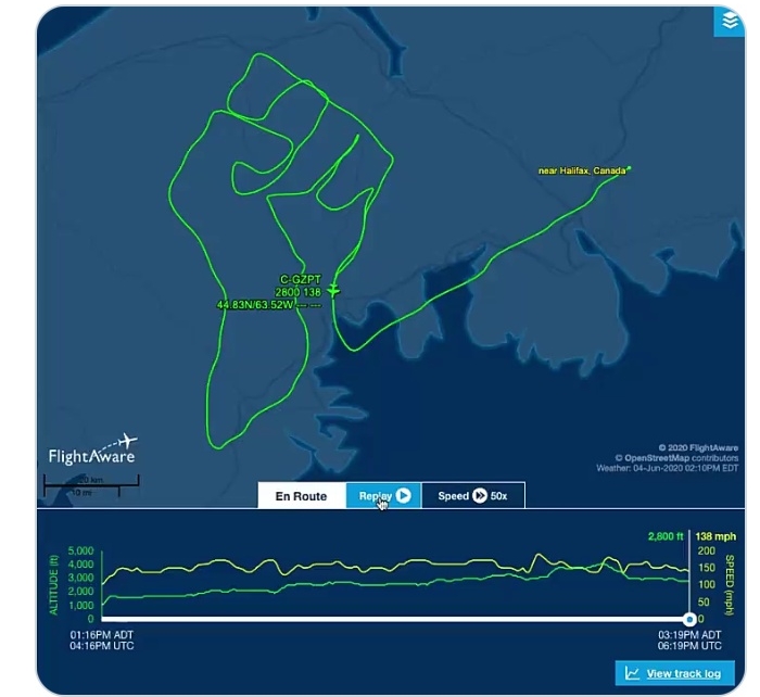 Un pilota ha realizzato un tributo aereo a George Floyd e al movimento antirazzista sorto dopo l’uccisione dell’afroamericano da parte di agenti di polizia a Minneapolis, Black lives matter, sul cielo del Canada seguendo una traiettoria di volo a forma di pugno alzato.