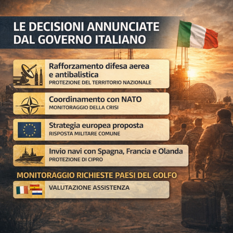 La crisi mediorientale ha già prodotto richieste di assistenza da parte di diversi Stati del Golfo. Il governo italiano sta lavorando insieme ai partner europei per valutare le possibili forme di supporto.