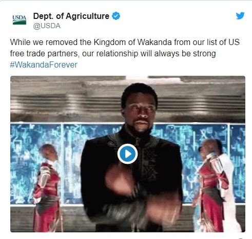 While we removed the Kingdom of Wakanda from our list of US free trade partners, our relationship will always be strong #WakandaForever pic.twitter.com/wiRSCIdfGh
