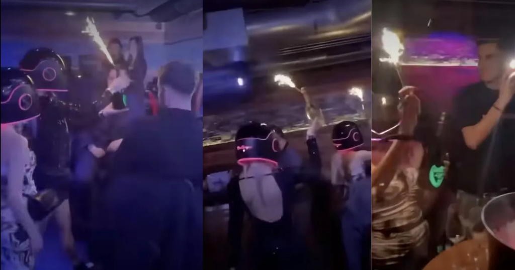 Le immagini mostrano giovani dipendenti e clienti che festeggiano nel seminterrato del locale, tra luci stroboscopiche, effetti pirotecnici e fumo artificiale.