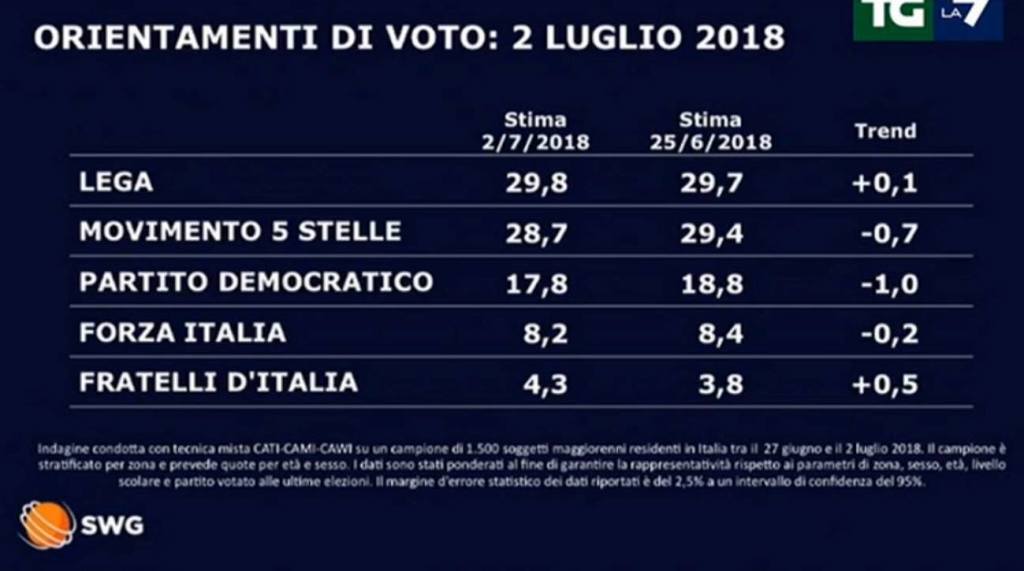 Non c’è storia in queste prime settimane del governo gialloverde a livello nazionale. Nonostante gli attacchi soprattutto sui social in tema di migranti la Lega si conferma mattatore di consensi secondo il sondaggio SWG per Tg La7 diffuso nella serata di ieri.