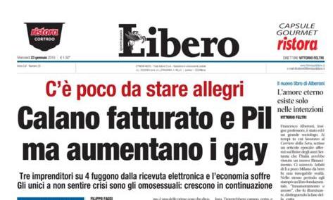“Calano fatturato e Pil ma aumentano i gay” è il titolo di apertura del giornale di Feltri questa mattina. Come già fatto in passato titolo provocatorio al solo scopo di far parlare di se. “Parlane male ma parlane spesso dice un adagio siciliano che sembra essere stato sposato dal giornale lombardo.