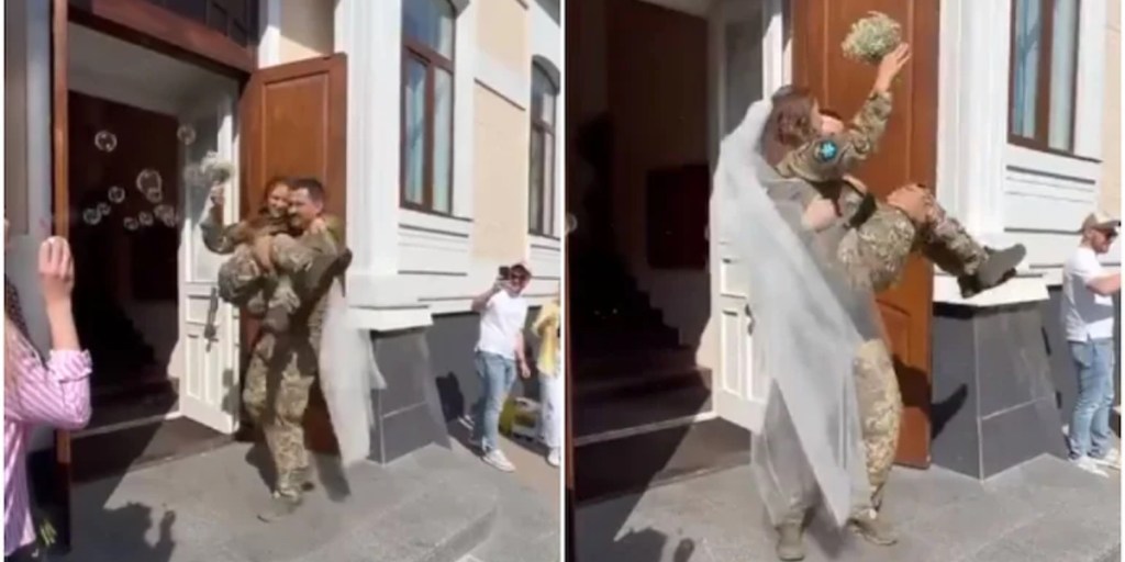 Una coppia si è sposata in Ucraina in uniforme militare. Il video è diventato virale sui social media.