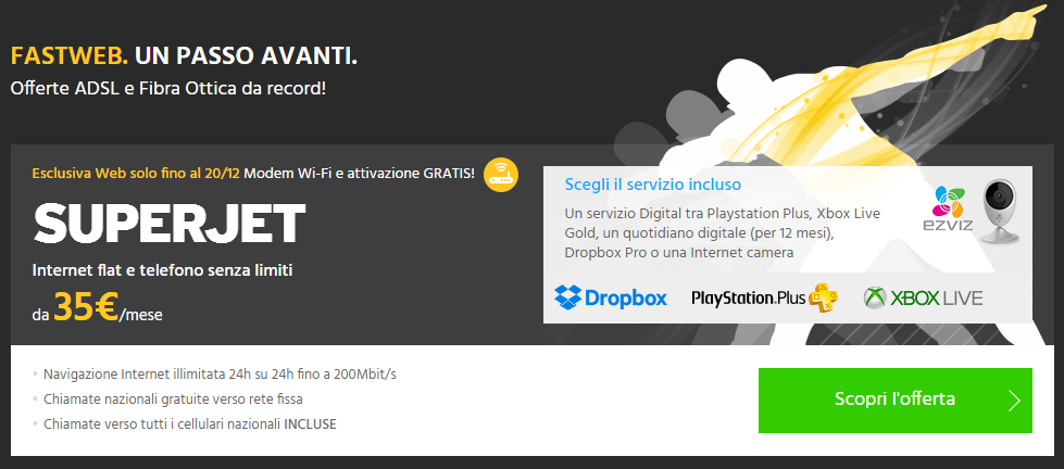 Diverse sono le promozioni attualmente disponibili, selezionabili sulla base delle proprie esigenze: in esclusiva per il web, scadranno il 20 dicembre. Iniziamo questa panoramica parlando della più completa, Superjet, che propone internet flat e telefono senza limiti a 35 euro, che salgono a 38 solo per gli utenti non raggiunti da rete Fastweb. L’offerta propone Modem Wi-Fi (a cui sono collegabili fino a 126 apparati) e attivazione gratuiti. Scendendo nel dettaglio, è inclusa la navigazione internet illimitata fino a 20 Mbit/s in download per utenti raggiunti da tecnologia ADSL, che salgono a 30 Mbit/s per quanti fossero invece collegati alla Fibra Ottica Fastweb. Per 12 mesi è inoltre proposta gratuitamente anche l’opzione UltraFibra, che porta la velocità a 200 Mbit/s. Per quanto concerne la telefonia, invece, sono comprese nel prezzo, senza scatto alla risposta, tutte le chiamate verso rete fissa e cellulari nazionali; inclusa nel canone anche l’applicazione MyVOICE home, che permette di trasformare il proprio cellulare in un cordless. E non è finita qui! Fastweb offre infatti ai nuovi abbonati un regalo di benvenuto, da scegliersi tra l’opzione Chiamate Internazionali (gratuita per 12 mesi) oppure tra un Digital Gift valido per un anno: preferisci l’attivazione di un servizio di gaming (Xbox Live, Playstation Plus), uno di archiviazione come Dropbox oppure una delle testate dell’Edicola Digitale?
