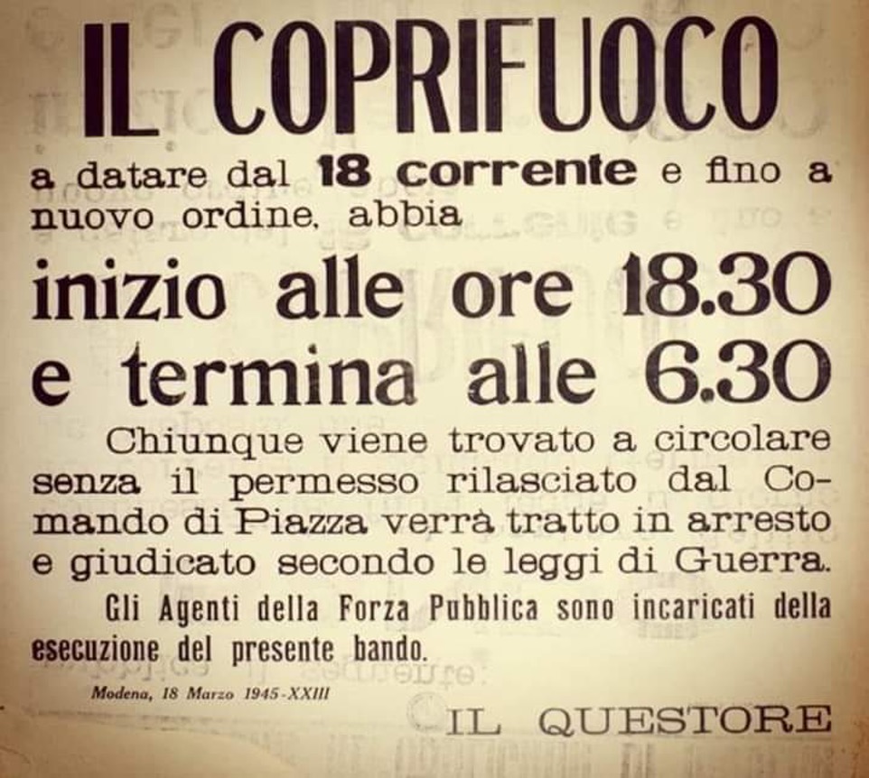 In età moderna, però, il coprifuoco è stato usato per indicare l’ordine di rientrare a casa dopo una certa ora, ad esempio durante la seconda guerra mondiale quando, durante l’occupazione nazista, fu imposto in varie città di non uscire di casa di notte per evitare assembramenti potenzialmente sovversivi (e, in caso di violazione, si rischiava molto grosso).