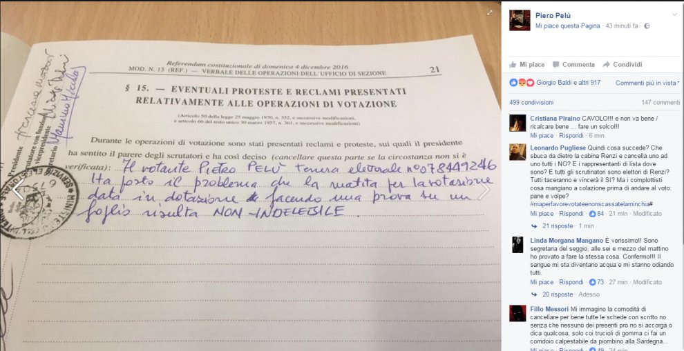 “Il votante Pietro Pelù tessera elettorale n. 078449246 ha posto il problema che la matita per la votazione data in dotazione facendo una prova su un foglio risulta NON-INDELEBILE” si legge sulla nota a verbale. Nei commenti però c’è chi fa notare che la matita è cancellabile su carta normale ma non sulla scheda.