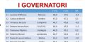 In testa a questa classifica c’è Emiliano in Puglia che sfiora il 58% seguito da Zaia della Lega Nord nel Veneto con 55,2% che però perde qualcosa. Buona performance per Toti di Forza Italia in Liguria con il 53,6% poi fino all’ottavo posto tutti sopra il 50% e tutti Pd (o centrosinistra). Sotto il 50% la fiducia per i governatori numero 9 e 10 ovvero Ceriscioli nelle Marche e Bonacini in Emilia Romagna.