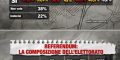 Sempre secondo questa indagine sarebbe vastissima la quota degli elettori M5s che si attesta fra gli indecisi. Viene rilevato ben il 40%. Dunque i pentastellati avrebbero ampi margini per far crescere il loro No convincendo i propri elettori mentre i margini di crescita del sì sarebbero contenuti nell’area che vota Pd e andrebbero cercati più nell’area centrista.