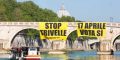 A Roma sono stati aperti due enormi striscioni a Ponte Sisto, sul Tevere, dove si poteva leggere “Stop trivelle” e “Il 17 aprile vota Sì”. A Torino gli attivisti hanno calato un altro grande striscione da Ponte Vittorio Emanuele I, sul Po, con la scritta “L’Italia non si trivella”. Un’azione analoga si è svolta infine a Venezia, sul Ponte degli Scalzi: questa volta lo striscione degli ambientalisti recitava “Meno petrolio, più rinnovabili”.
