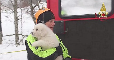 Un momento di felicità nel dramma che si sta vivendo. Tre cuccioli di cane estratti vivi dalla valanga che ha sommerso l’albergo di Rigopiano. Si tratta della cucciolata di una coppia di razza pastore abruzzese che si era salvata dal rovinoso evento. Dei figli di Nuvola e Lupo, così si chiamano i due cani, non si era invece saputo più niente.