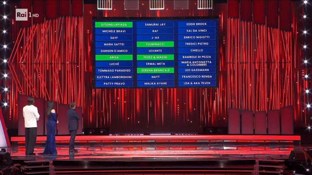 Spicca la prova di Fulminacci, apprezzato per scrittura e misura. Serena Brancale emoziona con un brano dedicato alla madre scomparsa. Ditonellapiaga apre la gara con energia dance e rompe la tensione iniziale. Arisa convince con un’interpretazione dal tono fiabesco. Nel duo Fedez-Masini colpisce la forza vocale di Marco Masini.