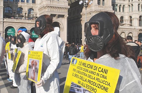 Protesta scenografica dell’OIPA (Organizzazione Internazionale Protezione Animale) contro l’uso delle pellicce. Avviene a Milano in coincidenza con una delle più importanti fiere di prodotti in pelle e pellicce. Un presidio nel cuore della città che ha voluto ricordare la morte di tante animali ma anche, afferma l’OIPA, di quel 86,3% degli italiani che sarebbe contro l’uso delle pellicce.