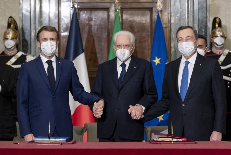 Il Presidente del Consiglio dei Ministri Mario Draghi e il Presidente della Repubblica Francese Emmanuel Macron hanno siglato il Trattato per una cooperazione bilaterale rafforzata al Quirinale, alla presenza del Presidente della Repubblica Sergio Mattarella.