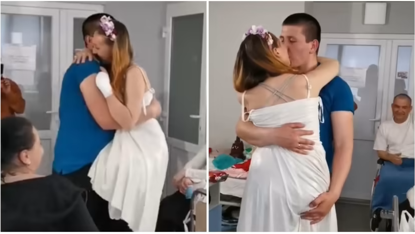 Oksana, 23 anni, e Viktor sono stati ripresi in ospedale, dov’è in cura la donna e dove si è tenuto il ricevimento nuziale.